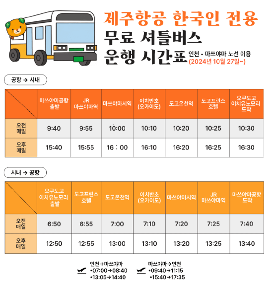 한국인 전용 무료 셔틀버스 승하차 정류장 안내 *하차 정류장 마쓰야마공항 → JR마쓰야마역 → 마쓰야마시역앞 → 이치반초(오카이도) → 도고온천역 → 도고프린스 호텔 → 오쿠도고 이치유노